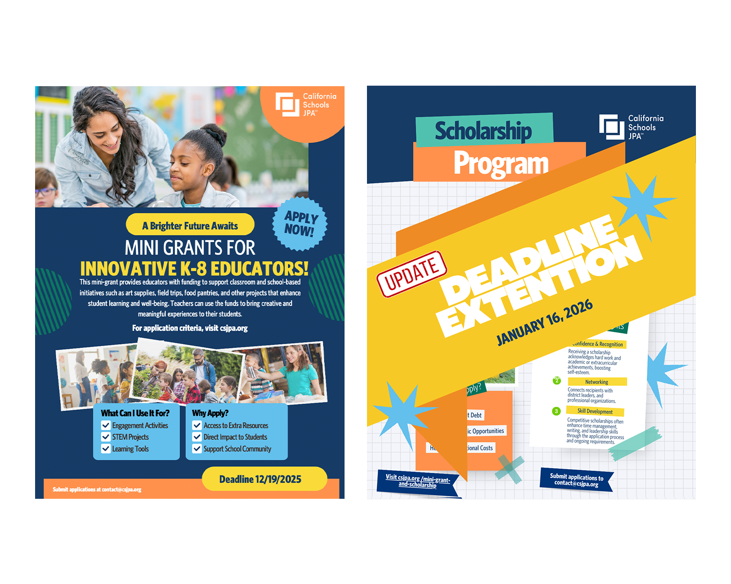California Schools JPA is committed to supporting both educators and students who bring innovation, care, and creativity to their school communities. Our Mini Grant Program will award ten $500 grants to K–8 educators developing projects that enhance learning, and five $1,000 scholarships to high school seniors who demonstrate leadership and insight through health and wellness or student safety and risk management.