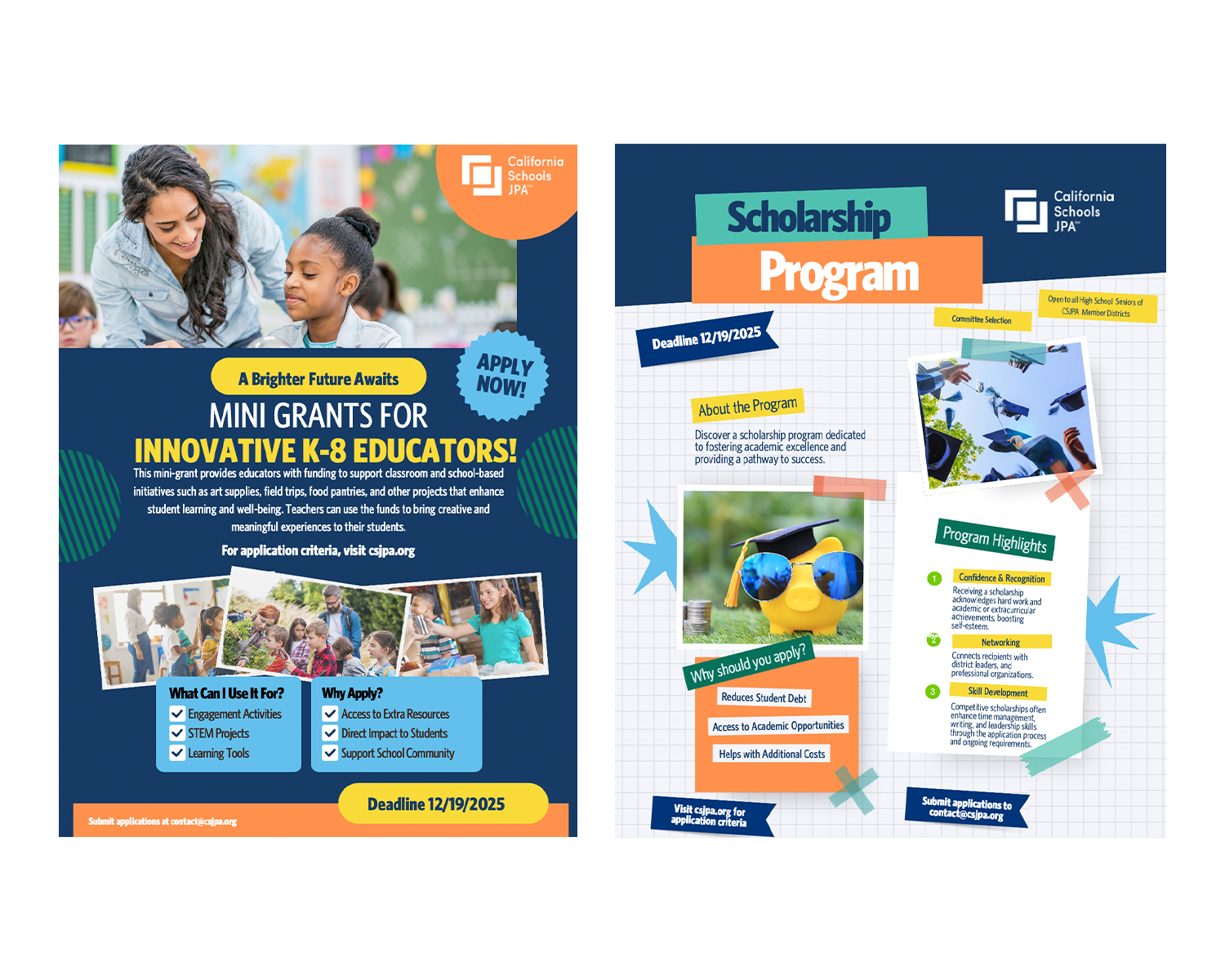 California Schools JPA is committed to supporting both educators and students who bring innovation, care, and creativity to their school communities. Our Mini Grant Program will award ten $500 grants to K–8 educators developing projects that enhance learning, and five $1,000 scholarships to high school seniors who demonstrate leadership and insight through health and wellness or student safety and risk management.